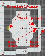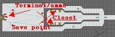 | ...go in this closet first. More life, ammo, and a save point. Caliburn fills you in on the above area. Here's the best plan: walking up to the top step activates the monsters inside so just walk up there then back up a lot and the troopers will grenade the people who come after you. Once no one else is coming, walk up to the door aiming slightly upward and start shooting after opening the door. If your sights are misaligned, quickly close the door and wait until the troopers stop grenading it. Then try again. The terminal ahead has a Neuralizer and ammo with more information. It then teleports you... |  | ||