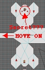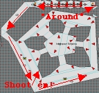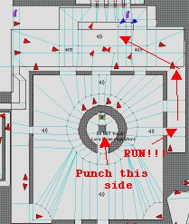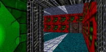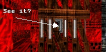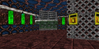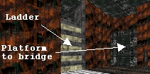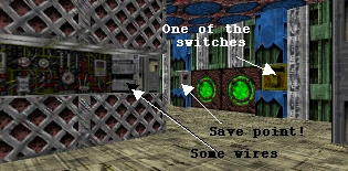 | ...there'll be a switch down there, hit it. Be patient, however, this is a lock. The purpose of this (and many of the lava areas) is to kill anyone who shouldn't be here as anyone who should be here should be able to teleport around as the pfhor do. Anyway, destroying the levee controls a couple of rooms ago caused the lava in here to filter out so you won't die. Moving on....kill everyone you see, head down the west hall first (or maybe later) to get a triple life power up. The east hall leads to a sort of maze that once you've found your way out, is a save point. See it in the picture? You CAN hit this even though it kinda seems impossible. Go through the next hall to... |  | ||