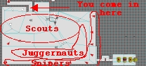 | ...where two Juggernauts, a bunch of snipers, and several scouts teleport into to have a final, climatic battle. A good battle plan is to try and eliminate a bunch of the snipers quickly. They distract the scouts from the Juggernauts which they can kill relatively quickly. Hit the switch on the south wall to activate a slow lift to cross the lava with, then head to the terminal, get the ammo and get outta there! |  |